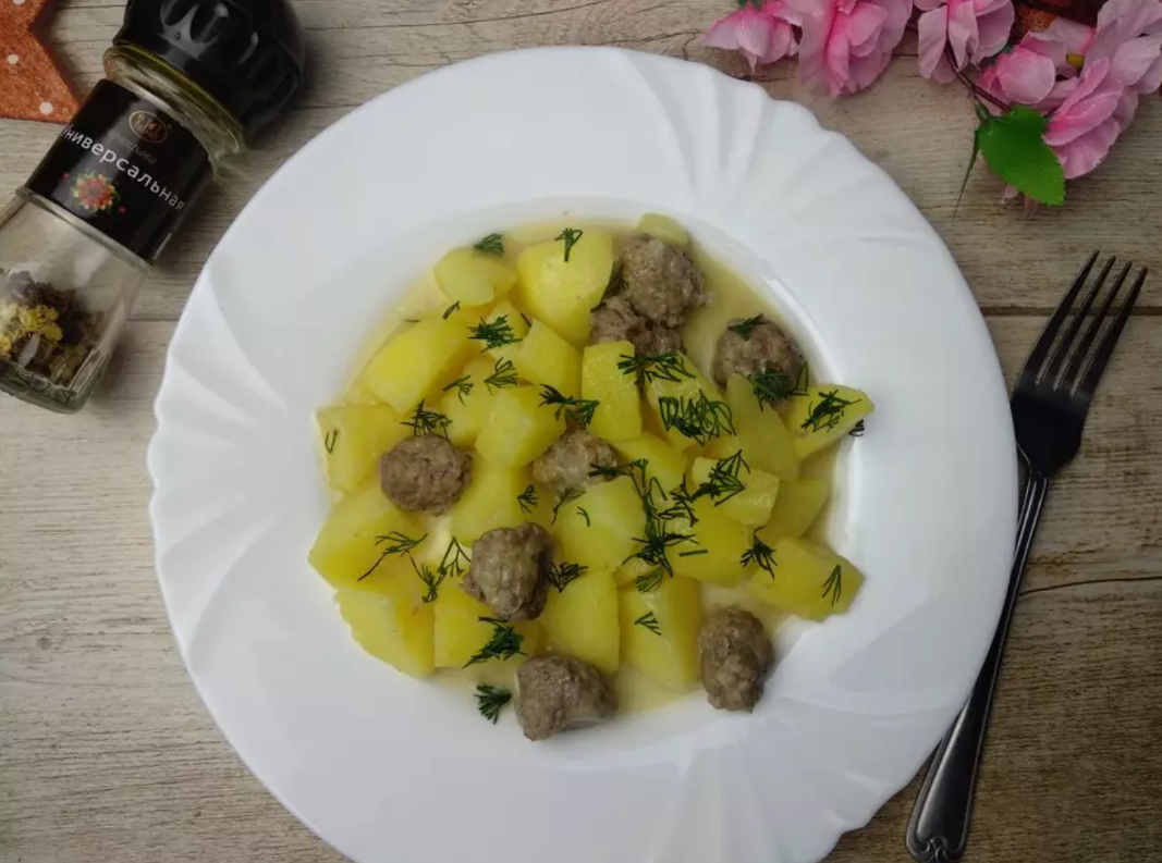 Картошка с мясными шариками – любимое многими сочетание в интересной подаче. Чтобы фрикадельки сохранили целостность при тушении, а вкус стал ярче, обжарим их с луком. Затем соединим с картофелем и потушим. Пропитанная мясными соками и ароматами картошка получается очень аппетитной и сытной. Ингредиенты : Приготовление : 1. Лук очищаем, нарезаем мелкими кубиками и слегка обжариваем. 2. Фарш солим, добавляем специи и хорошо перемешиваем. 3. Формируем фрикадельки размером чуть меньше грецкого ореха и отправляем к луку. 4. Обжариваем, периодически перемешивая, до изменения цвета и лёгкой румяности, примерно 5-6 минут. 5. Картофель чистим, режем средними кусочками. 6. Выкладываем картофель к фрикаделькам. 7. Вливаем горячую воду, чтобы картошка была немного погружена в воду. Солим, добавляем специи, тушим под крышкой до готовности картофеля, примерно 30 минут. 8. Сытный и вкусный ужин или обед готов! Перед подачей можно добавить зелень. Приятного аппетита!