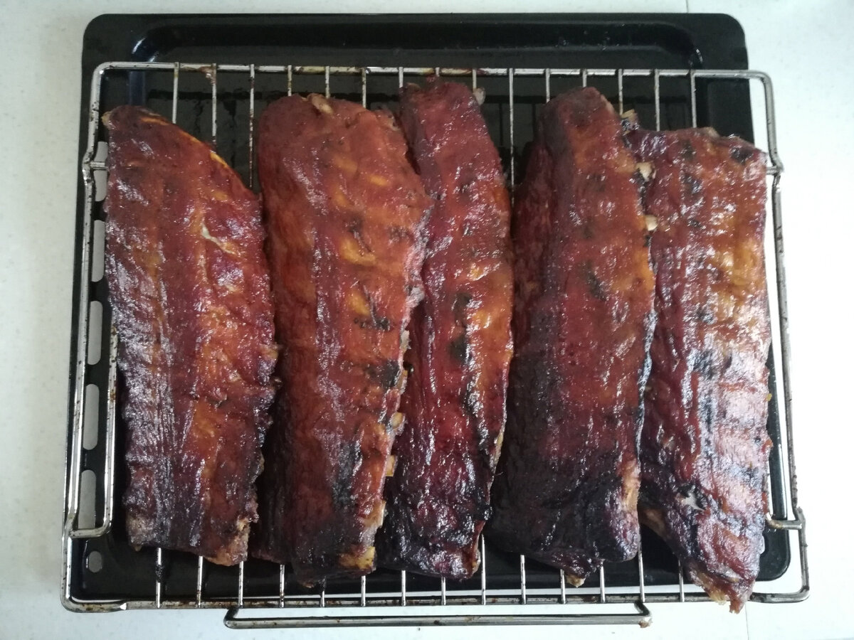 Вот тут вставлю единственный комментарий в данный рецепт: готовить в газовой духовке труднее, поскольку она дополнительно сушит ребра. Можно смело ставить на 120, если духовка позволяет такие низкие температуры.