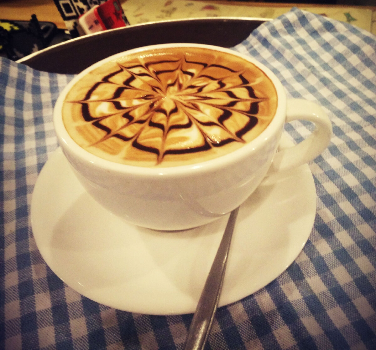 Растворимый кофе заварите в кипятке. Разогрейте молоко в микроволновой печи на максимальной мощности в течение 2 минут, добавьте какао-порошок и хорошо перемешайте. Влейте какао-молоко в кофе и хорошо размешайте. Взбейте сливки. Аккуратно переложите взбитые сливки поверх кофе. Нанесите шоколадный топпинг в виде двух или трех кругов на поверхность сливок. Заостренной бамбуковой палочкой или шампуром проведите аккуратные линии из центра кружки к ободкам, сформировав рисунок из топпинга. Примечание: