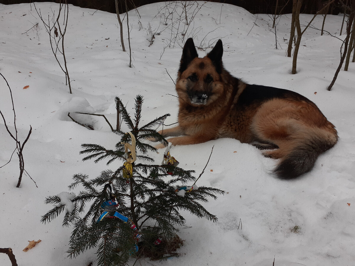 У нас тепло и пасмурно. Темно даже днем. Встретили в лесу украшенную елочку. Маленькую. Кто-то прилепил на дерево зайца. От этой кормушки улетел дятел с орехом в клюве. Хорошо погуляли! :)