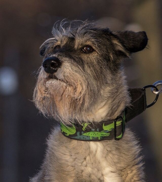 Москва. Метис шнауцера Ева получила на новый год в качестве подарка на новый года очаровательный ошейник с крокодилами и зимнюю фотосессию благодаря нашему бессменному фотографу Ольге. Еве недавно исполнилось десять лет, несмотря на это она весьма подвижна, в меру энергична, одинаково любит и короткие променады, и дальние долгие прогулки. Она не хулиганит дома и ничего не портит, не лазает по столам, нормально уживается с собаками,и на кошек ноль внимания" (с) как дома, так и на улице. Правда, может что-то съедобное схватить на улице, но вполне хорошо отдаст всё подобранное по команде «Нельзя!» В остальном на улице ведёт себя как истинная леди, приученная к выгулу - не тянет поводок, не ходит первая знакомиться к посторонним, абсолютно не агрессивна. Ева чень ласковая и любит спать под боком у своего человека, работать грелкой. По размеру Ева выше среднестатистического миттеля, но ниже некрупного ризена, она не широкая, но высокая и звонкая. А ещё она обладательница шикарного почти что