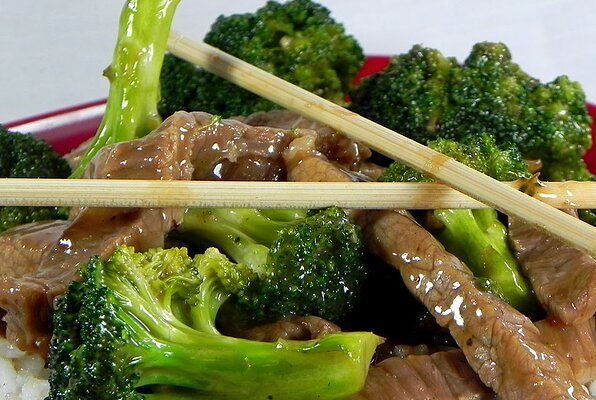 Китайский рецепт жаркого из говядины и брокколи, отличный вариант на ужин за считанные минуты! 4 порции. Ингредиенты: Маринад для говядины: Соус: Приготовление: Тонко нарежьте говядину. Замаринуйте говядину с ингредиентами «маринад для говядины». Хорошо перемешайте. Поместите соцветия брокколи в контейнер, пригодный для использования в микроволновой печи. Добавьте 1-2 ст л воды. Неплотно накройте крышкой или влажным бумажным полотенцем и поставьте в микроволновку на 2 мин. Готовьте, пока брокколи не станет мягкой, но все еще хрустящей. Нагрейте вок на средней огне с 1,5 ст л масла Гхи. Как нагреется, убавьте немного огня, добавьте чеснок и имбирь. Добавьте щепотку соли и жарить, помешивая, до появления аромата (около 10 секунд). Увеличьте огонь до среднего, добавьте маринованную говядину. Равномерно распределите говядину по дну вока и готовьте, пока края говядины не станут слегка темными и хрустящими. Добавьте соус и жарьте около 1 минуты. Добавьте брокколи, жарьте еще 30 сек. Переме