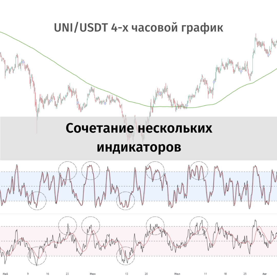 Для повышения точности сигналов, получаемых от индикаторов их лучше совмещать. Вы можете самостоятельно совмещать различные индикаторы и смотреть исторические данные для выведения своей связки, которая позволит открывать хорошие сделки, самое главное пробовать. Много пробовать:) Из изученных нами ранее индикаторов мы можем попробовать совместить Стохастик и RSI. Стохастик сильно волатильный осциллятор, его постоянно бросает в области перекупленности и перепроданности, он намного быстрее RSI. Сигналы на Стохастике поступают раньше, из-за этого часть из них менее надежная. Совмещая индикаторы можно отслеживать совместное достижение зон перекупленности и перепроданности. Стохастик будет постоянно бросать в крайности, то перекупленность, то перепроданность. Наша задача ожидать, когда более медленная линия RSI достигнет той же зоны, что и Стохастик. Это будет являться отличным подтверждение для открытия позиции (рис. 1). Хорошая комбинация может получится, если совместить осциллятор с полос