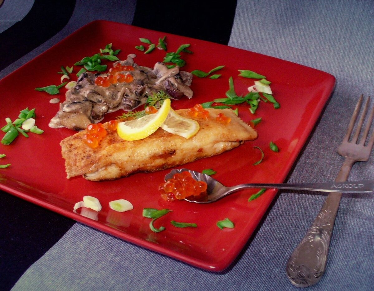Сегодня готовим камбалу Глосса. Камбалой глоссика назвать трудно, мелкий и невнятный, особенно для жителей нашего городка у моря, привыкших к полноценной черноморской камбале. Но когда сезон на глоссика, его много, недорого и он свежайший, то можно и его в дело пустить) * Камбалу Глосса почистить, вымыть, полностью обсушить и нарезать на порционные куски. Посолить, поперчить и панировать в муке. Обжаривать до румяной корочки, на растительном масле. * Репчатый лук нарезать полукольцами. Шампиньоны почистить, нарезать средним кубиком. Обжарить лук и шампиньоны на топлёном сливочном масле. Влить жирные сливки, приправить, протушить. Количество сливок - опционально, в зависимости от желаемой густоты соуса. * Подавать камбалу глосса с грибным соусом, украсить зелёным луком, лимоном и красной икрой.