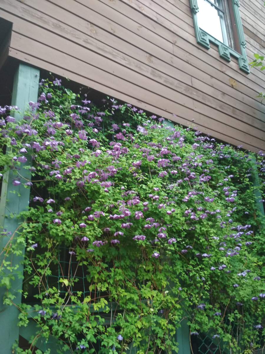 Третий оставался задохликом несколько лет, и мы решили пересадить его на длинную узкую рабатку вдоль нового дома, к трём клематисам витицелла. Там он наконец зацвёл, цветки очень красивые, но каждый год их всего лишь несколько штук. Я думаю, может быть, это клематис второй группы обрезки, поэтому он капризничает? Если кто-нибудь опознаёт его, буду очень благодарна.
