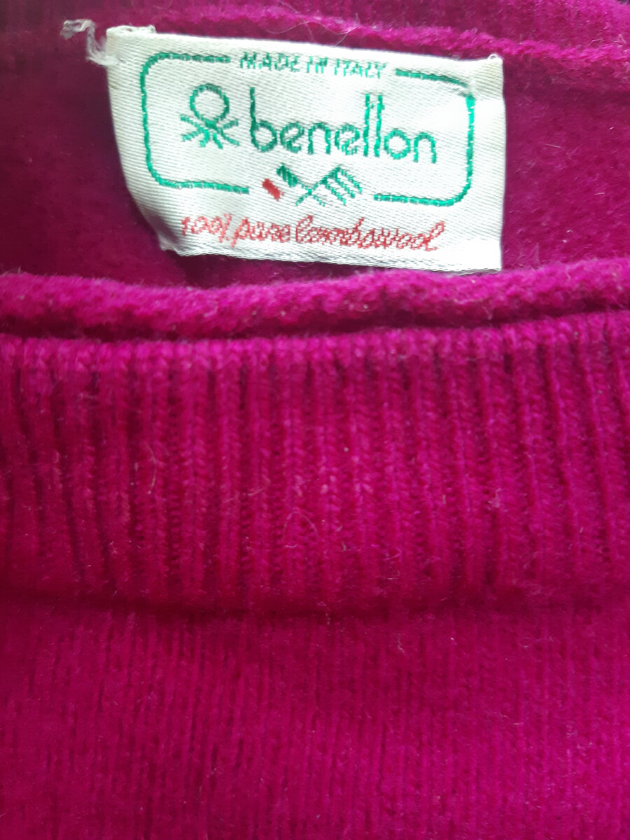 Гигантский малиновый свитер из 100% шерсти, Benetton, и судя по бирке винтаж. Размер большой, а рукава коротки. Нелепо на мне смотрится. Не взяла, хоть он и итальянский. 380р.