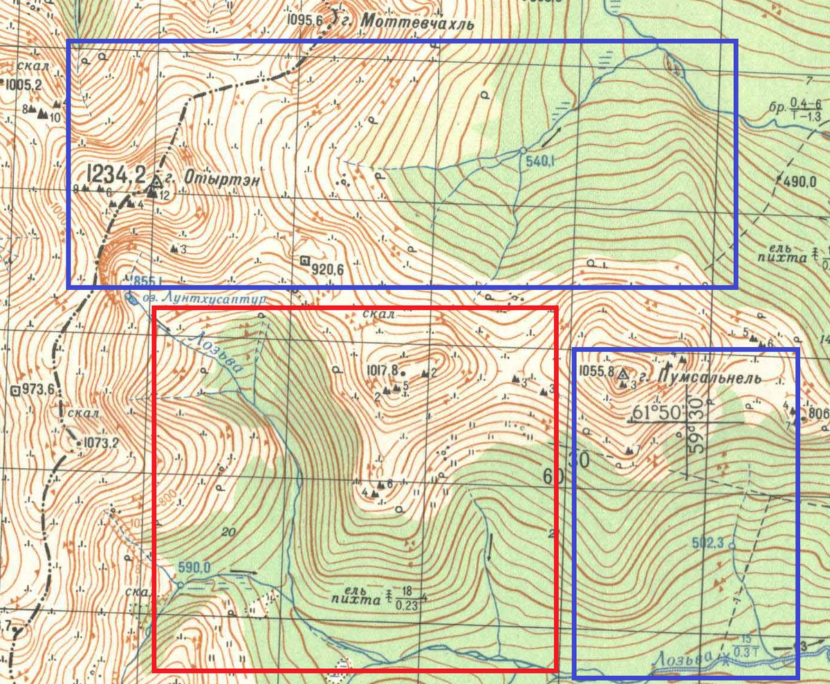 На карте верхним синим прямоугольником выделена зона, которую охватила поисковая группа М. Аксельрода – это бассейн реки Сульпа и сама гора Отортен. Синим нижним обозначен район поиска группы Б. Слобцова – гора Пумсальнель с южными окрестностями. Далее первая группа была на вертолёте вывезена в Ивдель, а вторая получила указание идти к реке Ауспия. Красным прямоугольником обозначена зона, которая не была исследована, и куда впоследствии поисковиков не допускали.