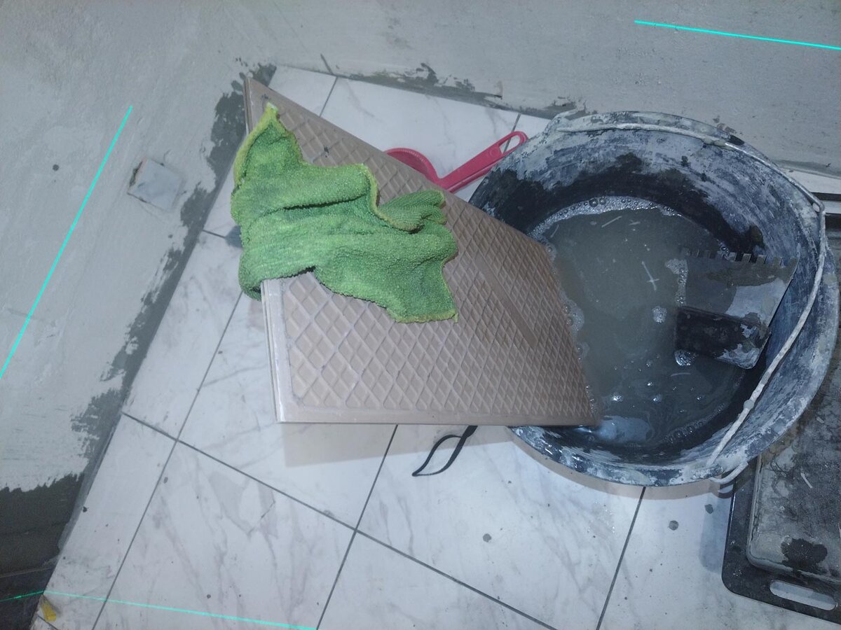В процессе укладки решил описать свое видение укладки в нескольких советах. Может, что то я делаю неправильно или не оптимально, буду благодарен более опытным товарищам за конструктивную критику. Как показывает мнение профессионалов (см комменты), советы получились скорее вредные, чем полезные. Удалять материал не буду, НО очень рекомендую ознакомиться с комментариями, (тем кто к теме просьба их дополнить). Ну и относиться к изложенному критически. 1. Итак, перед укладкой плитку надо смачивать (это делается для того, чтобы сухая керамика не тащила слишком быстро влагу из клея и он нормально схватился - цементу для гидрации нужно достаточное количество воды). 2. Для того, чтобы плитка легла не стене ровно (несмотря на возможные дефекты самой стены), необходимо выставить так называемые маяки. Для этого лепим первую плитку. Затем над ней под потолком лепим осколок аналогичной плитки (если клей жидковат и плитка сползает с толстого слоя, то можно ввернуть в стенку саморез - потом все это