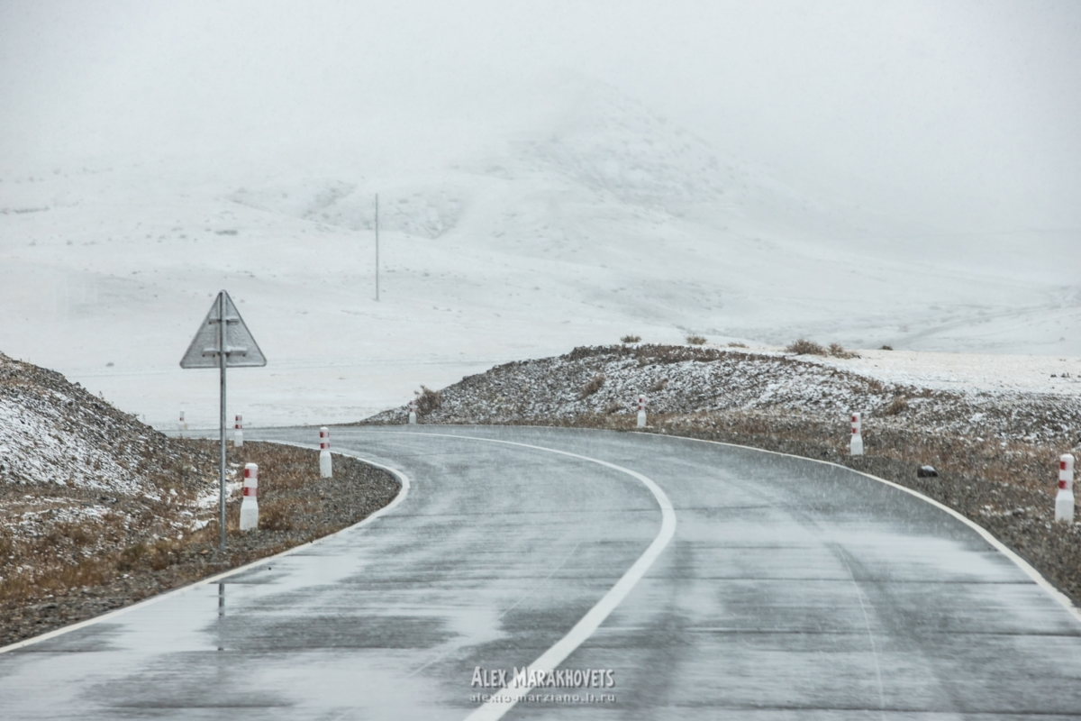 Отрезок Дарви — Алтай оказался одним из самых скучных за всю поездку. Глазу зацепиться не за что, одни камни и низкие горы на горизонте. Через пару часов подъехали к перевалу, за которым нас ждал Алтай — административный центр Гоби-Алтайского аймака в западной Монголии. Дорога резко пошла наверх с отметки 1700 метров до 2300 на пике. Температура опустилась до -1, повалил густой снег. Появился риск обледенения дороги, что не добавило бы нам приятных ощущений на летней резине.