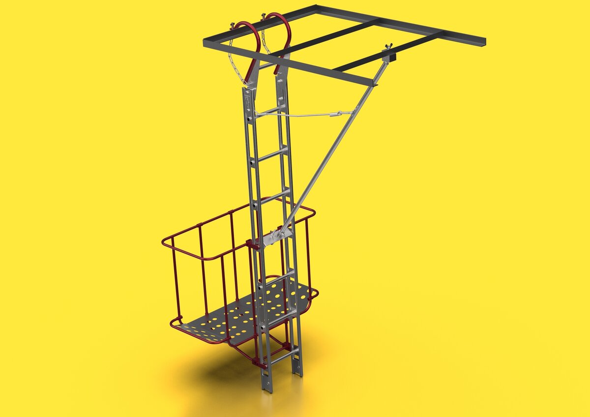Лестница подвесная с навесной площадкой длиной 2,8 м предназначена для размещения на ней не более одного электромонтера с инструментом для проведения монтажных и ремонтных работ на поддерживающих зажимах, гирляндах изоляторов и проводах на промежуточных опорах ВЛ. Подвесная лестница с навесной площадкой изготавливаются в климатическом исполнении УХЛ категории 1 по ГОСТ 15150. Лестницы выпускаются в трёх модификациях длиной 2,8 м, 3,4 м и 4 м. В состав подвесных лестниц с навесной площадкой входят: лестница, выполненная из алюминиевого сплава, снабженная захватом, состоящим из подвесных крюков с цепными стропами, выполненных из стали, упора, выполненного из алюминиевого сплава и навесной площадки. Навесная площадка может легко переставляться с шагом 300мм в пределах длины подвесной лестницы на необходимый для работы уровень. Упор удерживает лестницу с установленной на нее площадкой в вертикальном положении. Упор устанавливается на любую из ступенек лестницы. В верхней части упор имеет