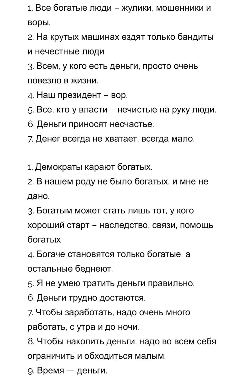 Именно эти установки я выявила у себя. На просторах великого и могучего интернета можно найти их списки, здесь оставлю самые частые. Они мешают зарабатывать больше, и проявляются в определённых реакциях и событиях, связанных с деньгами. Определите какие ограничивающие убеждения у Вас есть, проработайте и искорените их.