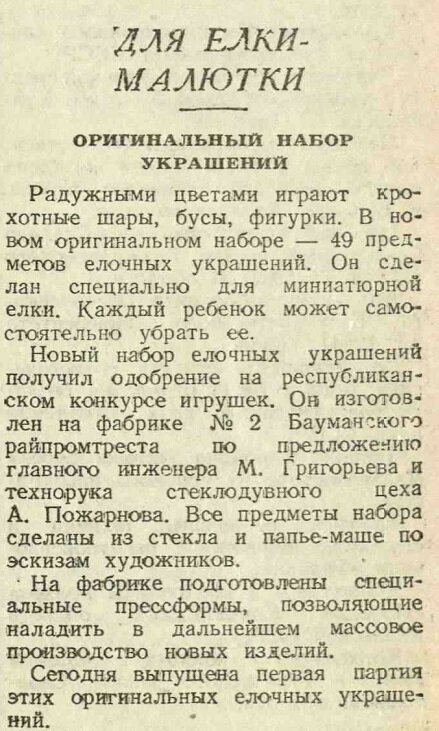 Новый набор елочных украшений получил одобрение на республиканском конкурсе игрушек. Он изготовлен на фабрике № 2 Бауманского райпромтреста по предложению главного инженера М. Григорьева и технорука стеклодувного цеха А. Пожарнова. Все предметы набора сделаны из стекла и папье-маше по эскизам художников.