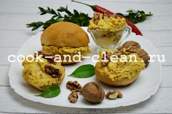 Мясо посыпаем щепоткой соли и обжариваем на кукурузном масле до готовности. Жарят индейку под крышкой на медленном огне, примерно 20-25 минут. Прямо в то масло, в котором жарилось мясо, кладем порезанный лук и натертую морковь. Можно добавить в сковородку 1-2 ложки масла, овощи должны хорошо подрумяниться. Ядра грецких орехов подсушиваем на сухой сковородке. Немного орехов оставляем для украшения паштета, а основную массу высыпаем в глубокую миску. Сверху кладем кусочки жареной индейки. Засыпаем мясо морк