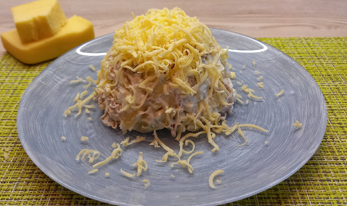 Очень простой в плане ингредиентов и очень мужской в то же время. Нашему женскому желудку подавай отварную курочку и огурчики, а тут картофель, свинина, яйца... Вобщем, чтобы накормить большого дядьку и разнообразить ежедневное меню - этот салат вам в помощь! Итак, ингредиенты: Лук - я беру маленькую головку и режу кубиками, заливаю кипятком на 10 минут, чтобы убрать горечь. При этом в кипяток добавляю по пол чайной ложечки соли и перца для пряности. Сыр - идет в тертом виде непосредственно при подаче. Начинаем: пока доходит лучок, режем все кубиками (я люблю мясо разделить на волокна. И соединяем продукты в глубокой миске Лук, конечно, отжать перед добавлением. Тщательно размешиваем, добавляем майонез и салат будет вязким и непослушным. При этом он хорошо принимает форму, чем мы и воспользуемся при подаче. Формируем горку на тарелке и посыпаем тертым сыром (по вкусу). Есть поесть! Приятного!
