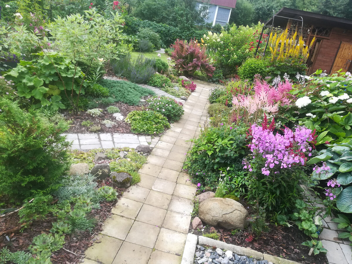 Главная дорожка идетпочти параллельно дома и упирается в почти перпендикулярную небольшую дорожку. Они соединяют входную зону, лужайку и огород. От центральной дорожки отходят второстепенные извилистые тропинки внутри и между цветниками.