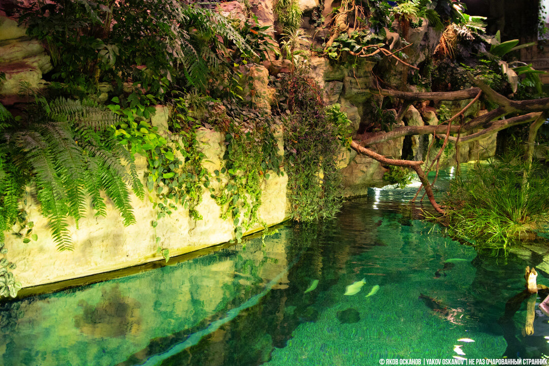 Об океанариуме в "Крокусе" я узнал случайно. Мы пришли на ёлку телеканала "Мульт", а по дороге к метро обнаружили, что в выставочном центре открылся океанариум. Я побывал в двух океанариумах Москвы – один расположен на Чистых прудах, а другой – "Москвариум" – на ВДНХ. Насколько я понял, в Крокусе он открылся недавно, и мы решили не отказывать себе в удовольствии и прогуляться. И не пожалели. Пройдёмся? Экспозиция поделена на три большие части: джунгли, реки и океан. Самая простая экспозиция – джунгли. Это большой сад тропических растений, среди которых расставлены террариумы с экзотическими животными, а кое-где прямо в кустах выпущены птицы. Выгляди всё довольно интересно и экспозиционно, не просто стеклянные ящики с животными, которые спрятались или не проявляют активности. Есть очень интересные животные и у некоторых террариумов я "застревал" надолго, пытаясь получить эффектный кадр. Кстати, разрешение на съёмку камерой нужно получить отдельно, но оно пустячное – 150 рублей. Речная