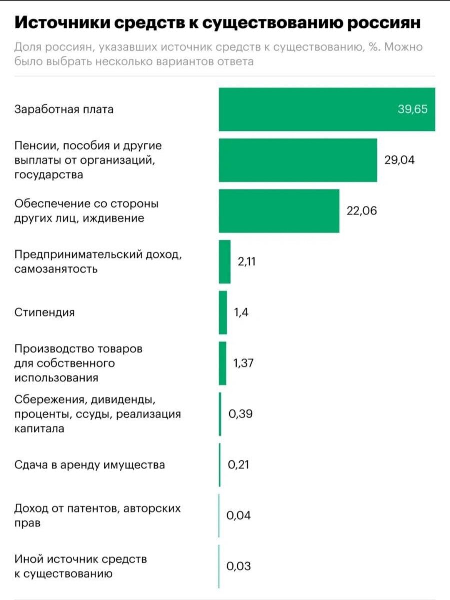 Разберем кто и на чем зарабатывает. Росстат опубликовал статистику об источниках получения денежных средств россиянами. Из данных статистики мы сможем смело делать вывод, что у нас " стареющая" нация, и необходимо срочно увеличивать рождаемость. Так как из 146 млн.человек только 39, 65 млн работают по найму и 2, 11 млн являются предпринимателями. Получается, что 43 млн россиян содержат 103 млн , так как на пенсиии и иждевении государства находятся 51 млн взрослого населения, дети и студенты не в счет. Сейчас мы наблюдаем спад рождаемости, хотя для того, чтобы население прирастало необходимо в каждой молодой семье до 35 лет рожать троих детей, а это сейчас маловероятно, женщины в 80% рожают одного ребенка и не хотят заводить еще детей по разным причинам. Если так все продолжится, то убыль населения будет 1 млн чел в год, к тому же население будет стареть, а молодого работающего населения просто будет очень мало, чтобы содержать действующее стареющее население без трудовых доходов .