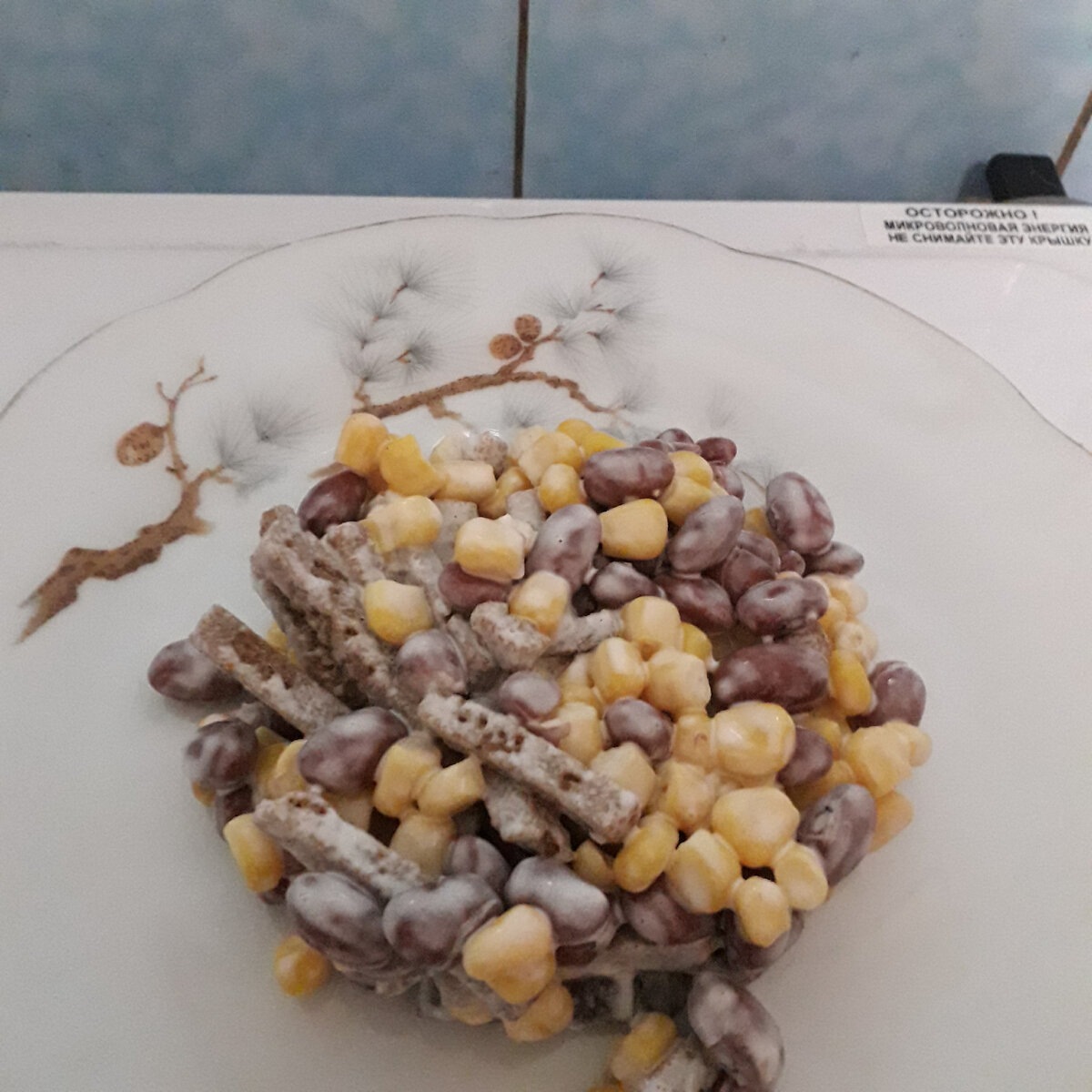 Когда-то я был советским студентом.А студент в Союзе это, в основной массе, существенно всегда бедное и всегда голодное.Но мы еще и находчивыми были и из минимума дешевых продуктов могли сделать приличное блюдо.Об одном салате я хочу Вам рассказать. Продуктов требуется минимум.Времени на приготовление еще меньше.При этом получается довольно необычное, по нашим временам, и, кстати, сытное блюдо. Мы открываем банку консервированной кукурузы и сливаем из нее жидкость.Тоже самое проделываем с банкой красной фасоли.Добавляем ржаные сухарики, я сейчас беру со вкусом чеснока, а в институте просто из черного хлеба их делали. Содержимое банок и пакетика с сухариками отправляю в миску, все тщательно перемешиваю и заправляю майонезом. Все готово!Раньше просто раскладывали по тарелкам а сейчас я выкладываю с помощью подаренного мне Дедом Морозом кулинарного кольца.В кольце хорошо уплотните салат поскольку ингредиенты довольно сыпучие и могут развалиться при снятии кольца. Приятного всем аппетита!