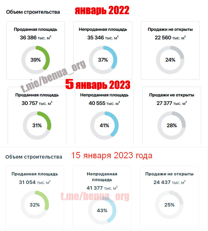 "Петербург поставил рекорд по вводу жилья. Однако в ряде СМИ появилась информация о том, что возникла проблема - девелоперы не могут его распродать." Прокомментировать данную ситуацию меня попросил журналист одного СМИ. Перед тем, как ответить я решил перепроверить имеющиеся у меня данные и сравнить их с официальной статистикой, которую я публиковал буквально 5 января 2023 года. И я к своему удивлению обнаружил, что всего за 10 дней количество нераспроданных новостроек в целом по России увеличилось на 2% пункта или на 5% в абсолютных цифрах. Смотрите данные на картинке. После увиденного ответил журналисту следующее: Нужно понимать, что часть введенного нового жилья в 2022 году была продана в предыдущие периоды, в 2020 и 2021 годах. Поэтому с реализацией сданных в 2022 году новостроек Я думаю проблем нет. Проблемы будут у тех новостроек, которые будут введены в будущем.