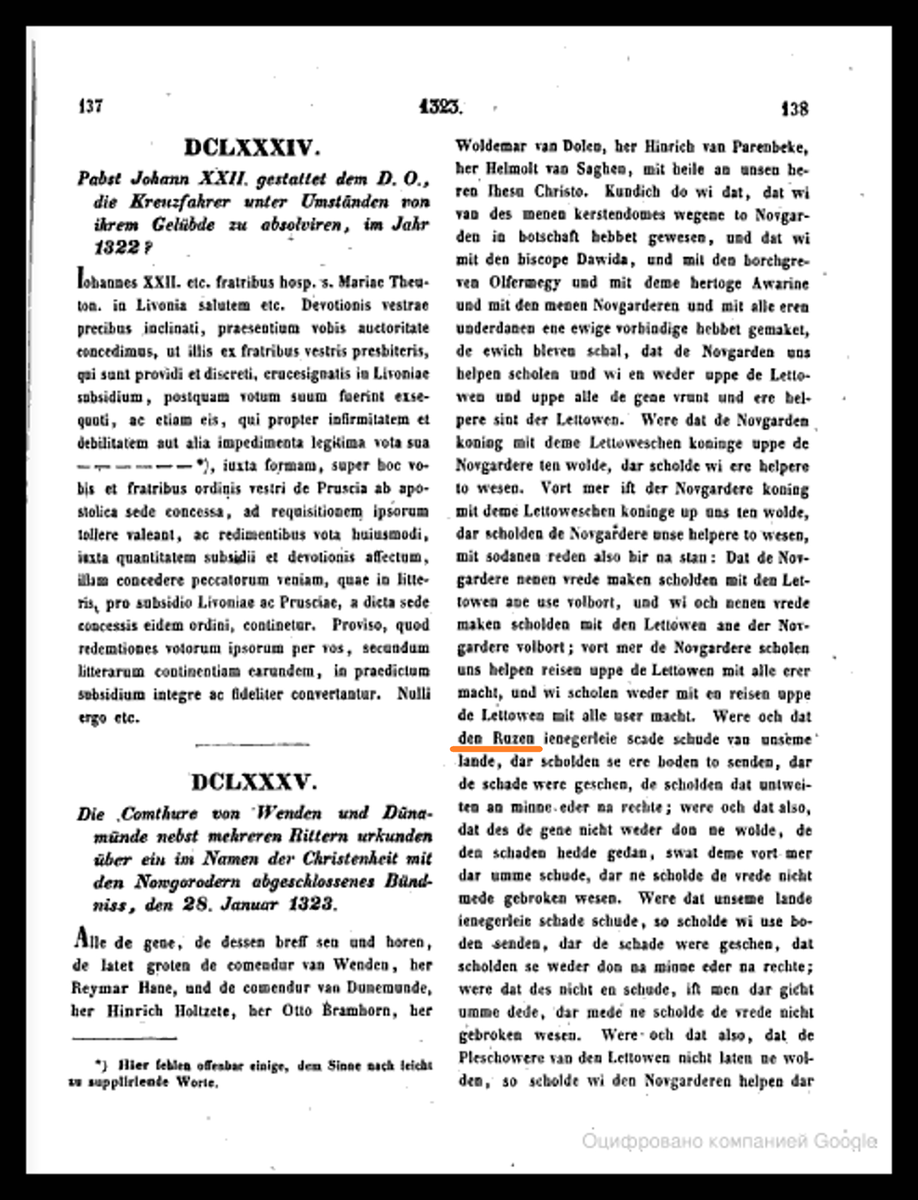 1323 г. января 28. — Договорная грамота Новгорода с Ливонским орденом о союзе. Датировка грамоты, предложенная В. Л. Яниным: 25 февраля 1323 года (Янин В. Л. Новгородские посадники. М., 1962. С. 178). Публикации с ливонского экземпляра договора - подлинника на пергамене: LUB, II, № 685 (стр.137-139); ГВНП № 37 (стр.65-67). Новгородцев в тексте грамоты называют также русскими (Ruzen): "А будет какое зло русским (Ruzen) от нашей земли, то пошлют они туда, где зло случилось, своих послов, которые дело уладят полюбовно или по суду; а если тот, кто причинил зло, не захочет его возместить, то, что бы с ним дальше по этому ни случилось, из-за этого мира не нарушать." "В подтверждение мы для указанных выше русских (Ruzen) привесили наши печати к этой грамоте, которая дана в год господа нашего 1323-й, в последнюю пятницу перед днем Святого креста." "В подтверждение того, что подлинные русские (Ruzen) грамоты, которые даны о союзе между новгородцами и всем христианством, от слова до слова так го