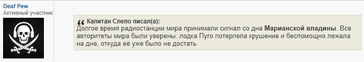 Капитан Слепо писал: Долгое время радиостанции мира принимали сигнал со дна Марианской впадины. Все авторитеты мира были уверены: лодка Пуго потерпела крушение и беспомощно лежала на дне, откуда её уже было не достать ...Вот, есть гора, да? Соответственно, есть и Горыныч. А есть эта яма в коре, там, вероятно, правит бал Марьяныч? Аще, - Марьяна.... Щас не поймешь... Туда по доброй воле - не-е-е-е.... Deaf Pew писал: тяжелые внутренние скафандры типа "Базальт" ...Глухов долго, весьма долго экспериментировал с так называемыми "внутренними скафандрами". Но это были вневедомственные исследования. Он имел стопроцентную уверенность, что выбранное направление правильное, сперва - как спасательное средство для угодивших в сложную внутренне-пространственную ситуацию, а позже и как спецсредство для изучения самых отдаленных закоулков и спецодежду для работы вне прочных корпусов - для устранения последствий аварий и т.д. Он сделал много эскизов, произвел массу достаточно тонких измерений и выч