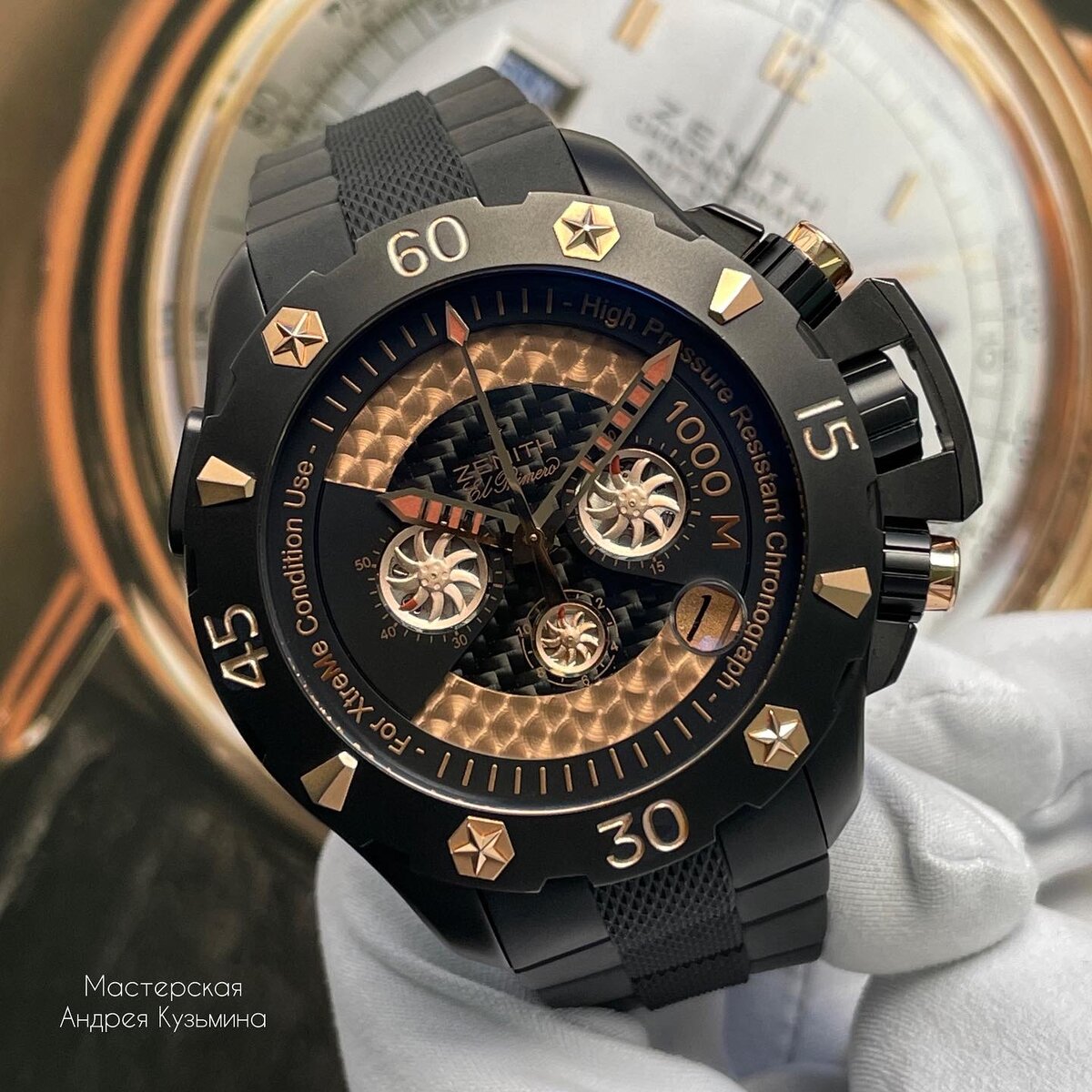 Всех приветствую в Новом, 2023 году🎄 Праздники уже давно закончились, так что пора возвращаться к интенсивным рабочим будням💪🏼 Сегодня расскажу Вам о часах Zenith из коллекции El Primero. Первая коллекция El Primero была представлена миру еще в 1969 году, что стало ключевым моментов в истории бренда. El Primero - это первый в истории интегрированный хронограф с автоподзаводом. И что интересно, для изготовления одного экземпляра часов из коллекции El Primero требуется в среднем 9 месяцев работы, более 2500 операций и участвует в этом - около 150 высококвалифицированных мастеров. Теперь вернемся к часам, которые побывали у меня в мастерской, Zenith Defy Extreme Chronograph Black PVD Titanium + Rose Gold. Это прекрасный спортивный мужской хронограф. Корпус часов комбинированный - титан и розовое золото. Ремешок - каучуковый с застежкой из розового золота. Механика с автоподзаводом. Хронограф. Водонепроницаемость до 1000 метров. Запас хода до 50 часов. Здесь было сделано техн