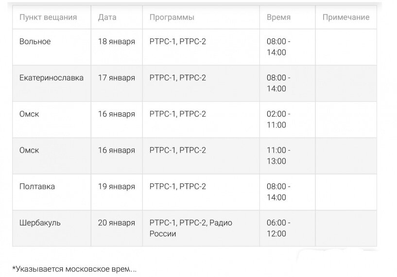 С 16 по 22 января в Омске и области ожидаются кратковременные перерывы в работе 19 телеканалов. Это связано с профилактическими и другими плановыми работами, требующие отключения передающего оборудования. Таким образом, в Омске проблемы с вещанием ожидаются 16 февраля с 05:00 до 16:00. В другие дни отключения пройдут в Полтавке и Шербакуле. Временно могут не работать следующие телеканалы: пакет РТРС-1 (Первый, «Россия-1», «Матч ТВ», НТВ, «Петербург — 5 канал», «Россия К», «Россия-24», «Карусель», «ОТР», «ТВ Центр»), а также телеканалы пакета РТРС-2 (Рент-ТВ, «Спас», СТС, «Домашний», ТВ-3, «Пятница», «Звезда» «Мир», ТНТ и «Муз-ТВ»). «Некоторые работы могут быть отменены (перенесены на другое время) из-за плохих погодных условий», — указано на сайте Цифрового эфирного телевидения. Читайте также на портале Om1.ru Причиной гибели многодетной семьи на пожаре в Белоусовке стала электропроводка