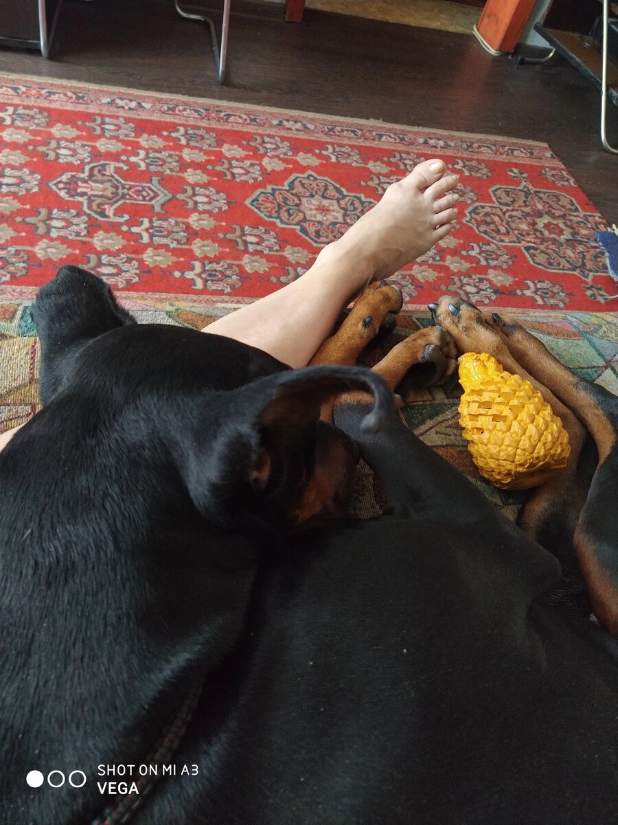 Сижу, смотрю фильм про Высоцкого. Вега спала, потом поиграла с ананасом(игрушка). Сама. Одна. Это вообще редкость. Снова улеглась. Давно не занимались. Вижу, мозг закипает у добермана. Смотрю кино. Не могу оторваться. В рекламу замечаю, что собаки в комнате нет. Что тоже необычно 😳. Пошла посмотреть, где она? Сидит на кухне у окна. В кресле 😄. Её любимое занятие дома - смотреть в окно. Но сейчас зима. На улице минус 21! Пару месяцев, как не открывала ей окно. Холодно. Открыла 😄. Радость.. Смотрю дальше кино. Вега пришла два раза, чтобы лизнуть меня, в благодарность. И опять уходит в окно. Всё - замёрзла. Вернулась ко мне на диван. Легла - спит. Люблю эту лапушку ♥️. И часто бывает стыдно, что не уделяю ей внимания (