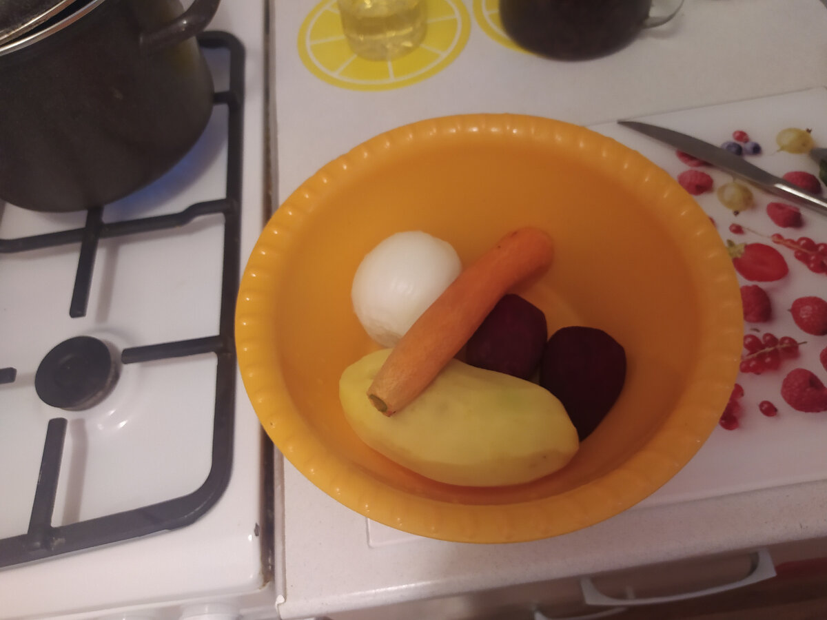 Сейчас у меня есть капуста, а на момент начала приготовления супа- не было. Поэтому о задуманном борще пришлось забыть. Прикинула ингредиенты, которые могу положить в кастрюлю. У меня получился лук, морковь, свёкла и картошка. Идея со свекольником пришла на ум тут же. От рагу в морозилке осталась половина упаковки. Я поставила косточки вариться. Чуть погодя, когда мясо почти сварилось, натёрла свёклу и морковь на крупной тёрке. Без обжарки положила к мясу, половинку луковки нашинковала и туда же. Следом мелко нарезала картошку и добавила к друзьям в кастрюлю. Нашла в холодильнике остатки консервированной фасоли и положила в кастрюлю. Добавила соль и помешала. Смотрю, а супчик жидковат. Чем загустить?🤔 Гречкой😃 Сказано-сделано! Чуток крупы промыла и в свекольник. Томатную пасту не добавляла! За пару секунд до выключения кастрюли размолола чесночка. Знаете, Друзья, сочетание свекольного и гречневого вкуса приятно удивили. Гречка так ненавязчиво оттеняет свеклу, а мясной