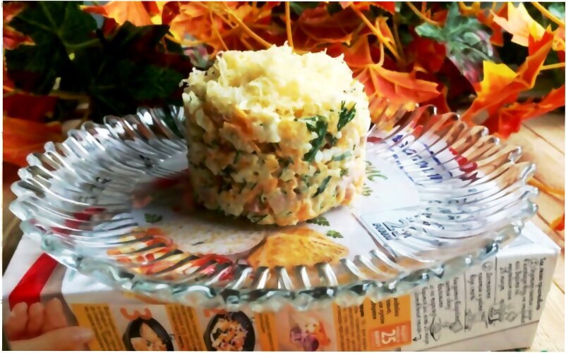 Описание: Сегодня у нас салат с ветчиной "Нежность". Салат получился вкусный и легкий. Готовить салат очень легко и просто. При желании можно заменить ветчину на варенную колбасу. Всем приятного аппетита! Ингредиенты: •1 пачка рис мистраль Кубань 63 г •100 г ветчины •2 куриных яйца •1 крупная морковь •1 зубчик чеснока •несколько веточек укропа •100 г твердого сыра •майонез(сметана, йогурт по вкусу) Пошаговая инструкция: 1.Отварим рис в подсоленной воде. Отварим морковь. Остудим и натрем на средней терке. Нарежем мелко зелень. 2.Промытый рис добавим в миску к салату. Нарежем ветчину мелкими кубиками. Пропустим чеснок через пресс. Добавим майонез, соль, перец. Все перемешаем аккуратно. 3.Выложить в форму салат, утрамбовать и посыпать сыром. Поставьте лайк и напишите комментарий ! Спасибо и приятного аппетита)