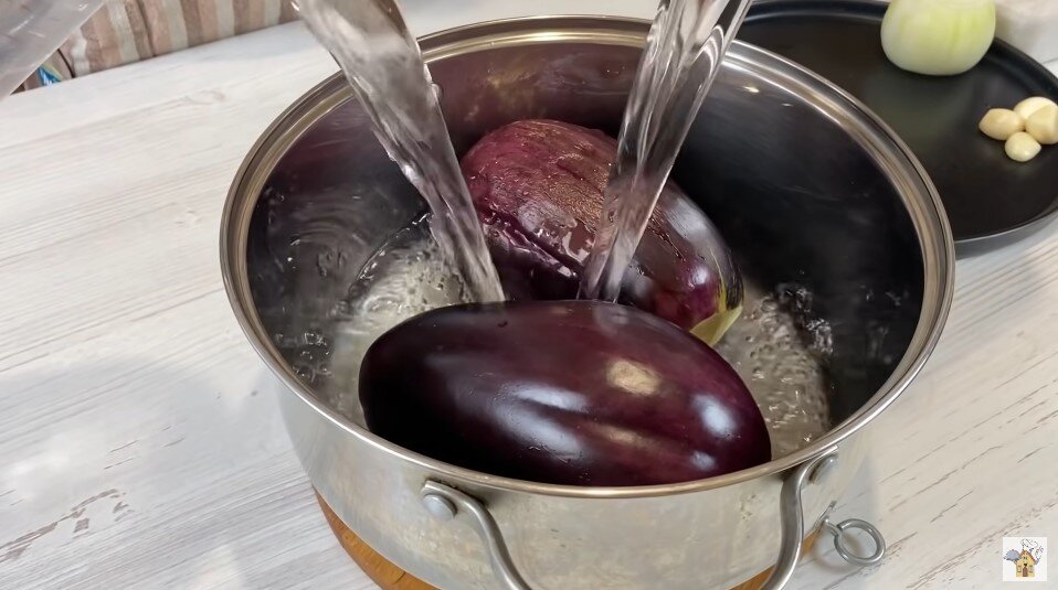Проще закуски я не встречала! Рекомендую готовить ее с вечера, чтобы она точно успела настояться и не манила всех членов семьи к холодильнику:) Закуска из маринованных баклажан — это невероятно вкусно. А главное, что ничего жарить не нужно и нет никаких сложных ингредиентов. Закуска получается в меру кислая и острая, мягкая и хрустящая. Обязательно попробуйте приготовить! Тем более что готовится все за 30 минут: У баклажан удаляем плодоножку, кладем в кастрюлю и заливаем водой. Добавляем соль,накрываем крышкой и ставим на огонь. После закипания варим минут 12-15, в зависимости от их размера. При желании баклажаны можно накалоть зубочистками и запечь в духовке до готовности. Пока баклажаны варятся, приготовим заправку. Для этого лук нарезаем полукольцами или четвертинками. Добавляем в него пропущенный через пресс чеснок, сахар, соль, растительное масло и уксус. Также при желании можно добавить черный молотый перец. Все хорошо перемешиваем и оставляем немного промариноваться лук. К этому