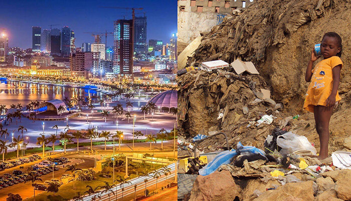 Роскошные небоскрёбы Луанды с презрением взирают на угрюмые трущобы, где живёт основная часть ангольцев. Частично высокая цена на все товары объясняется тем, что здесь всё импортное. Собственное производство весьма немногочисленно. Кроме того, дороговизне способствуют крупные иностранные нефтяные компании, которые платят целые состояния, привлекая высококвалифицированных специалистов из-за рубежа.