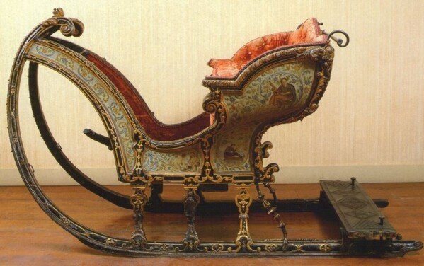 В это же время появилась традиция богато украшенных резьбой саней. Из дерева вырезались целые скульптурные группы, особенно популярны были мифологические фигуры, боги и обитатели воды: тритоны, дельфины.
