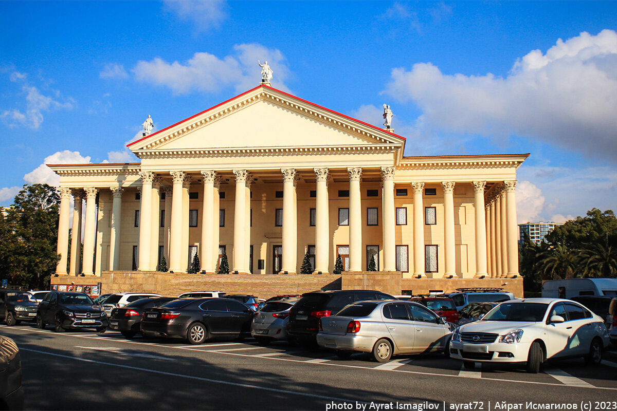 В 30-х годах прошлого века началась масштабная реконструкция города Сочи и этим процессам особое внимание уделял сам товарищ Сталин. Здания в городе строятся в стиле неоклассицизма, в городе появляются роскошные ансамбли. Санаторий им. Орджоникидзе, к примеру. Загадкой остается, как в годы такой значимой стройки в конкурсе проектов здания Зимнего театра победил никому не известный архитектор Константин Чернопятов? Вот уж, прям по классике времени: молодым везде у нас дорога! Хотя в жизни такие факты в те годы практически не случались. Самой же таинственной загадкой остается информация о наличии тайного подземного хода. Он, якобы, вел напрямую в Сталинскую ложу в театре. Такая ложа на самом деле есть, только неизвестно был ли И.В.Сталин в сочинском театре. Колонны с коринфскими капителями расположены вокруг здания по всем фасадам. Их количество 88 (кстати, именно столько клавиш у рояля). Как известно, в Сочи не очень хорошие грунты по несущей способности, конструктив здания потребовалос