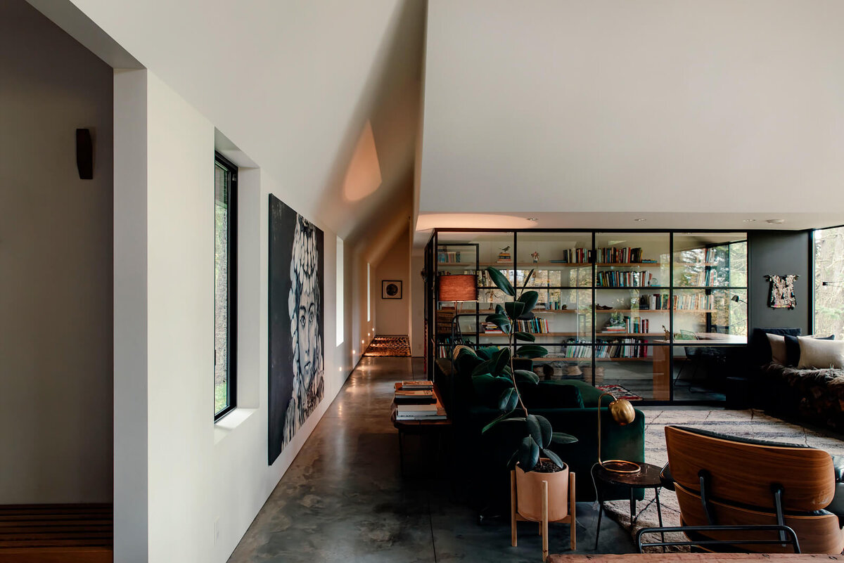 Интерьер и экстерьер одноэтажного барнхауса в лесу, Канада