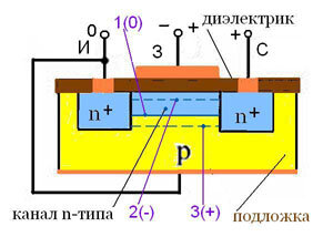 Этот транзистор отличается только тем, что при изготовлении не получают проводящего канала между истоком и стоком (рис.3).