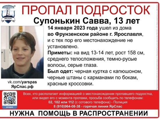 Слава Супонькин, 13-ти лет покинул свой дом во Фрунзенском районе Ярославля в субботу , 14 января. С тех пор родные не знают, где он и что с ним. Рост пропавшего158 см, выглядит на свой возраст или немного старше, волосы темно-русые, глаза серые. В момент ухода был одет в черную куртку-пуховик, черные штаны-карго с карманами и черные кроссовки. Если вам известно, где Слава, или вы знаете, где он был с 14 января, позвоните по телефонам 112, 102 или 8-910-964-08-38
