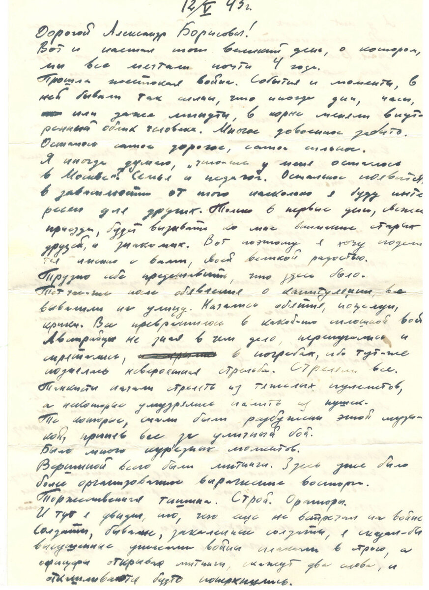 В Музее музыки хранится огромное эпистолярное наследие выдающегося пианиста, профессора Московской консерватории Александра Борисовича Гольденвейзера — в нем около 15-ти тысяч писем! Многие из них написаны в годы войны учениками, коллегами и знакомыми музыканта. На одном из писем дата — 12 мая 1945 года. Да, оно написано спусти три дня после Победы в Великой Отечественной войне, и это определяет его тон и содержание. Автор письма — Наум Бродский, ученик Гольденвейзера. «Хочу поделиться с Вами своей великой радостью», — пишет автор. Объявление о капитуляции Германии застало его в Австрии, в небольшом городке недалеко от Вены. Автор описывает реакцию солдат, офицеров, жителей города — ярко, образно и эмоционально. «Трудно себе представить, что здесь было. Тотчас же после объявления о капитуляции все вышли на улицу. Начались объятия, поцелуи, крики. Австрийцы, не зная, в чем дело, перепугались и спрятались в погребах, ибо тут же поднялась невероятная стрельба. Стреляли все. Танкисты начал