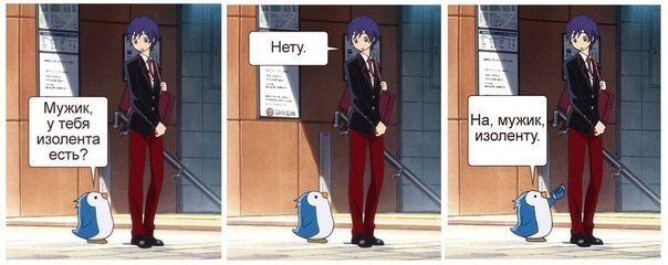 Пора немного снизить градус элитарности с помощью милых пингвинов. Вы наверняка знаете мем про пингвина, протягивающего пареньку изоленту. Вы все правильно поняли, кадры из Mawaru Penguindrum были использованы для данного интернет-шедевра.