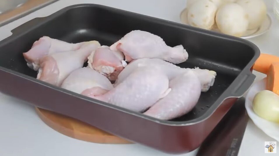 Несмотря на то, что я обожаю готовить, не всегда есть силы и время долго стоять у плиты. Сегодня хочу поделиться с вами рецептом простого, но вкусного ужина в духовке. Он относится к разряду «нарезал, смешал, запек и все готово». Все овощи, кроме грибов, наверняка есть у вас в холодильнике, да и курица думаю найдется. Так что и в магазин ходить не нужно. Ужин получается сытным, курица сочной, а овощи мягкими и по-простому вкусными. Давайте приготовим вместе: Форму смазываем растительным маслом. Курицу (можно брать любую ее часть, но мне больше нравятся бедрышки или голени) хорошо промываем, обсушиваем и кладем в форму. Лук нарезаем четвертинками, а морковь кружочками. Если она крупная, то можно нарезать полукольцами. Перекладываем к курице. Дальше шампиньоны. У меня они достаточно крупные, поэтому я нарезаю четвертинками. Если мелкие, то достаточно будет разрезать напополам. Грибы также отправляем к остальным ингредиентам. Картофель я также нарезаю достаточно крупно, мне так больше нра