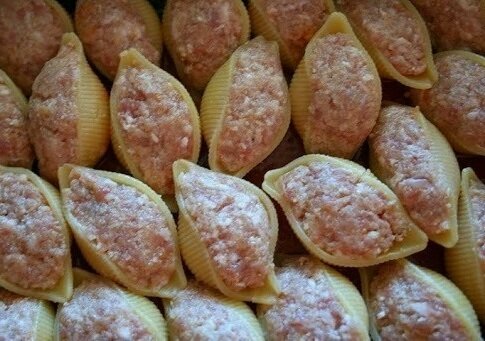 ИНГРЕДИЕНТЫ: Макаронные изделия "ракушки" - 500 гр. Говяжий+свиной фарш - 350 гр. Рикотта - 250 гр. Сыр Пармезан - 100 гр. Лук репчатый - 60 гр. Зелень петрушки - 15 гр. Зелень базилика - 10 гр. Перец черный молотый, соль - по вкусу Оливковое масло - 4 ст.л. Готовый соус бешамель - 1200 мл. ПРИГОТОВЛЕНИЕ: В кипящей, чуть посоленой воде + 2-3 ст.л. растительного масла, отварить ракушки, затем слить в дуршлаг и дать остыть.Мясной фарш смешать с рикоттой, мелко нарезанным и слегка обжаренным луком, рубленой петрушкой и базиликом. Посолить, поперчить, добавить 50 гр. соуса бешамель (рецепт) и скатать небольшие шарики, подходящие по размеру к ракушкам. Готовые, остывшие ракушки начинить подготовленным фаршем и выложить в форму для запекания или глубокий противень.Залить соусом бешамель и запекать в хорошо разогретой духовке при 180 град. в течении 20-25 мин.