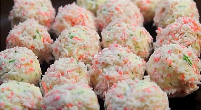 Предлагаю вам рецепт праздничной закуски "Рафаэлло". Названа она так, потому что очень похожа на одноименные конфеты с кокосовой стружкой. Блюдо получается нежное и немного острое по вкусу, отлично подойдет на любой семейный праздник. Желаю кулинарных успехов! Какие продукты нам понадобятся для приготовления: За полчаса до приготовления закуски кладем крабовые палочки в морозильную камеру и затем натираем на мелкой терке. Отставляем их пока что в сторону. Также измельчаем куриные яйца и сыр. Перемешиваем яйца и сыр с половиной массы натертых палочек. Соединяем с измельчённым чесноком и майонезом и все перемешиваем. Смачиваем руки водой и начинаем лепить шарики, не забывая всовывать в середину шарика четверть обжаренного орешка. После этого обваливаем "рафаэллки" во второй половине натертых крабовых палочек. Перемещаем шарики на тарелку, украшаем листовым салатом или петрушкой. Приятного вам аппетита! Если вам понравился рецепт, поддержите статью лайком и своим комментарием. Готовили