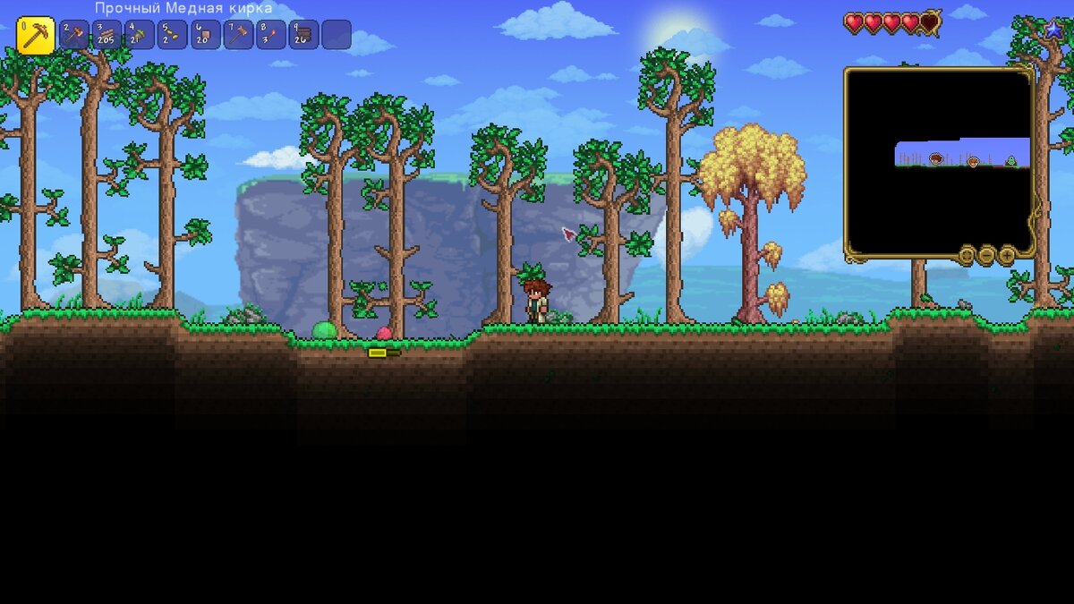 Привет! В этой статье я начну прохождение террарии 1.4.4.9 в режиме мастера за класс призывателя, с правилами класса - можно использовать оружие и броню только на призывателя. Сразу после появления я начал рубить деревья. Оружия у меня пока нет, а его поисками я займусь потом, так что сейчас вся надежда на гида. Кое-как дома я всё же построил , параллельно подводя к гиду слизней и пинки. После решил всё же заняться поисками оружия, пошёл в левую сторону и выяснил что слева у меня зимний биом, темница и порча. Можно ожидать чем это закончилось... Потом всё-таки добрался до темницы, нашёл живое дерево, а в нём первое оружие - посох зяблика. Затем решил отправится в пещеры за ресурсами, и чуть не наступил на ловушку... Потом нашёл много изумрудов, подумал что на крюк, но нет. После нашёл ещё ловушку, но по интереснее, и хотел её залутать, но слился от дротика... Но потом залутать сундук всё-же смог. А потом снова умер. Потом нашёл несколько сокровищниц, и вот что я получил после часа грин