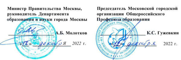 «Соглашение учитывает положения и рекомендации соглашений, заключенных на федеральном, межрегиональном, региональном и отраслевом уровнях социального партнерства, включая Отраслевое соглашение по организациям, находящимся в ведении Министерства просвещения Российской Федерации, на 2021‑2023 годы, Московское трехстороннее соглашение на 2022‑2024 годы между Правительством Москвы, московскими объединениями профсоюзов и московскими объединениями работодателей.».