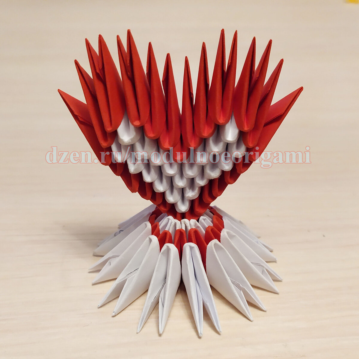 Здравствуйте, Друзья! Не за горами 14 февраля - день всех влюбленных. В связи с этим предлагаю посвятить наше занятие сбору ВАЛЕНТИНОК. Список мастер классов. Для изготовления одной валентинки нам понадобится 81 модуль: 37 красных, 44 белых. Цвет модулей можете выбрать на свое усмотрение. Как собирать модули, можно посмотреть здесь. Все модули собираем длинной стороной вверх. Начнем со сбора сердца. Первый ряд 2 красных модуля. Второй ряд 3 модуля: 2 красных, 1 белый. Третий ряд 4 модуля: 2 красных, 2 белых. Четвертый ряд 5 модулей: 2 красных, 3 белых. Пятый ряд 6 модулей: 2 красных, 4 белых. Шестой ряд 7 модулей: 3 красных, 4 белых. Седьмой ряд 8 модулей: 4 красных, 4 белых. Восьмой ряд 6 модулей: 4 красных, 2 белых. Девятый ряд 4 красных. Соберем подставку, под наше сердце. Собираем 3 ряда в кольцо по 12 модулей в каждом. Первый ряд 12 белых, второй ряд 12 красных, третий ряд 12 белых. Ставим наше сердце на подставку (место соединения при необходимости можно смазать клеем). Поздравля