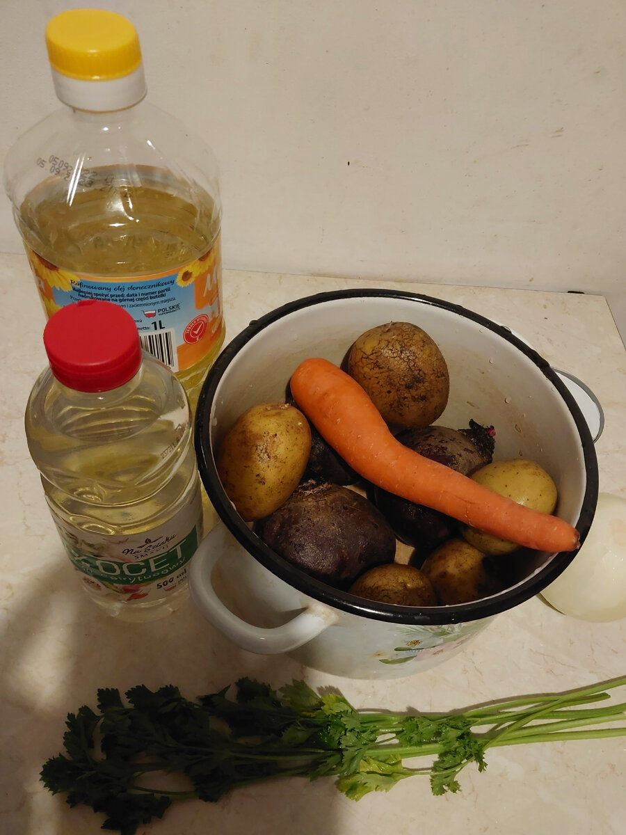 Хорошая альтернатива винегрету: горошек заменяем на кукурузу)) Продукты: -свекла(мелкая) - 3 штуки; -картофель - 5 штук; -морковь - 1 штука; -лук - 1 штука; -петрушка - пара веточек; -кукуруза консервированая - 1 банка, 200грамм (к сожалению фотосессию на первоначальном этапе пропустила); -уксус - 2 столовые ложки; -масло подсолнечное - 10 столовых ложек; -соль в конце - по вкусу Свеклу, картофель, морковь - закидываем в общую кастрюлю, засыпаем столовую ложку соли и ставим на огонь. После закипания, морковь и картофель вынимаем примерно через 20-30 минут, а свеклу следует поварить около 1 часа. И все это потом остудить. У нас в запасе час, поэтому едем дальше: -открываем банку кукурузы, сливаем воду, высыпаем в емкость для приготовления салата; -мелко шинкуем лук и петрушку, ссыпаем к кукурузе; Прошло назначенное время, овощи сварились и остыли Снимаем с них оболочку Шинкуем морковь, картофель, свеклу кубиком и ссыпаем в общую емкость Добавляем заправку из уксуса и подсолнечного масла