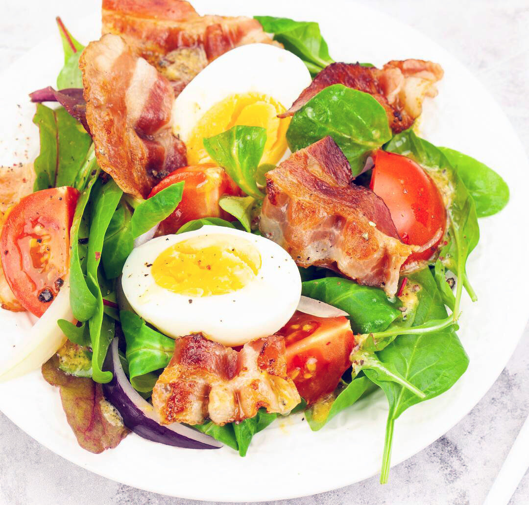 Салат с копченым беконом - один из самых интересных и быстрых в приготовлении салатов. Он очень вкусный и рецепт его невероятно прост. Ингредиенты: 1 упаковка копченого бекона смесь салатов: руккола, айсберг, детский шпинат 200 г помидоров черри половина небольшого лука красного - 50 г 3 сваренных вкрутую яйца горчичный соус: 3 столовые ложки оливкового масла; 3 столовые ложки лимонного сока; 1/4 чайной ложки перца, чайная ложка горчицы Начните с варки яиц вкрутую, а затем очистите и отложите в сторону. Далее сделайте быструю заправку для салата. В одну миску положите вместе: 3 столовые ложки свежевыжатого лимонного сока; 3 столовые ложки оливкового масла; 1/4 чайной ложки свежемолотого перца; чайная ложка горчицы. Смешайте ингредиенты соуса и отложите. Положите смесь салатов, помидоров и лука. Тщательно вымойте помидоры и нарежьте их на более мелкие кусочки. Нарежьте лук тонкими перьями. Время для копченого бекона. Просто поместите ломтики бекона один рядом с другим в холодную и суху