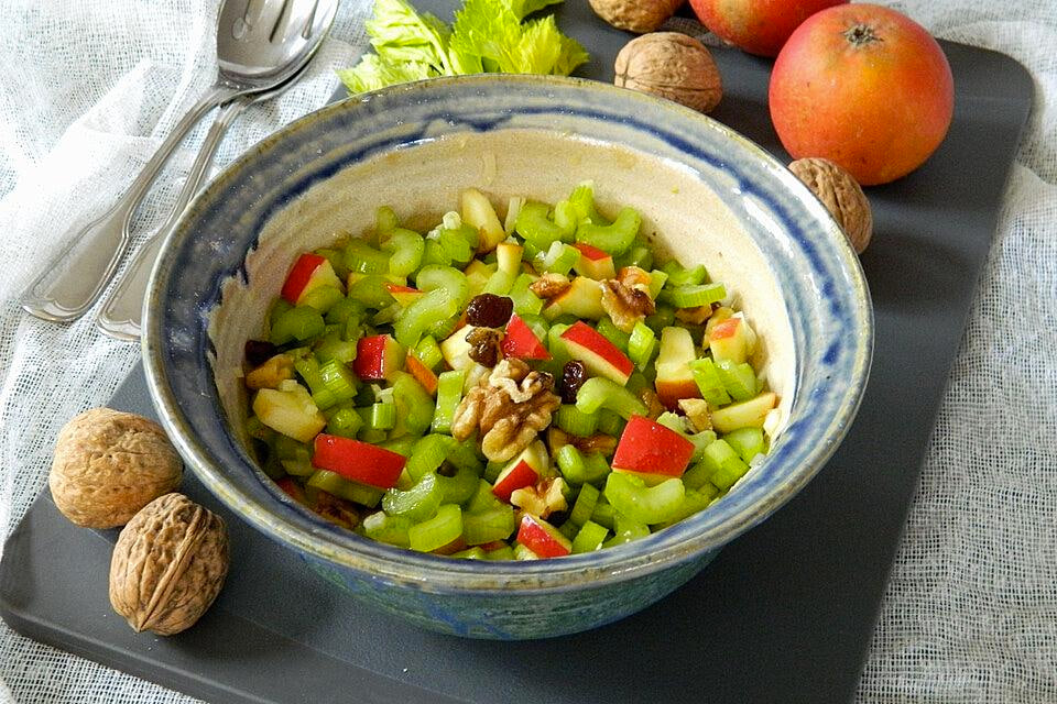 Салат очень сезонный, хотя в нем ни капусты, ни свеклы с морковкой. Есть в нем схожесть с уолдорфским – за сет сельдерея и яблока.