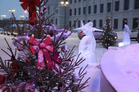 Для жителей и гостей города подготовили сразу пять фотозон, ледовый городок с лабиринтом и горкой и волшебный лес из 100 елочек. Антураж помогает посетителям окунуться в советскую эпоху и вернуться назад в прошлое. В центре ледового городка возвышается Спасская башня Московского Кремля. Рядом установлена скульптурная композиция — портрет Юрия Гагарина, ракета и его знаменитые слова, высеченные на глыбе льда: «Поехали». Напротив – олимпийский факел и Миша. Это уже талисман Олимпиады 1980 года. Крокодил Гена приглашает малышей прогуляться по ледовому лабиринту.