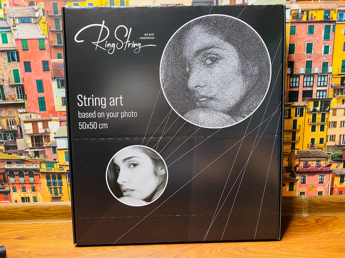 У лучшей подруги жены на носу день варенья, а значит надо что-то дарить. Естественно хочется подарить что-то оригинальное и интересное, особенно человеку, у которого все есть. Долго выбирали подарок и таки решили подарить картину, сделанную нитью. Зацените, какая красота получилась в конце. Так же в конце обзора вас ждет подарок. Фишка в том, что это набор для создания картины нитью из любой фотографии, называется RingString. Мы выбираем любое фото (желательно с крупными деталями), загружаем его на сайт и нам приходит инструкция по сборке. Не понятно? Сейчас расскажу подробнее... Сразу скажу, что человек, которому мы будем дарить, весьма занятой, поэтому решили сделать картину сами и подарить уже готовую. Итак, набор для создания картины RingString. Коробка весьма внушительных размеров, которая, кстати, выступает в роли мольберта. Нехитрыми манипуляциями она превращается подставку, на которой очень удобно творить. Внутри нас ждет инструкция, подставка для телефона (она понадобится при